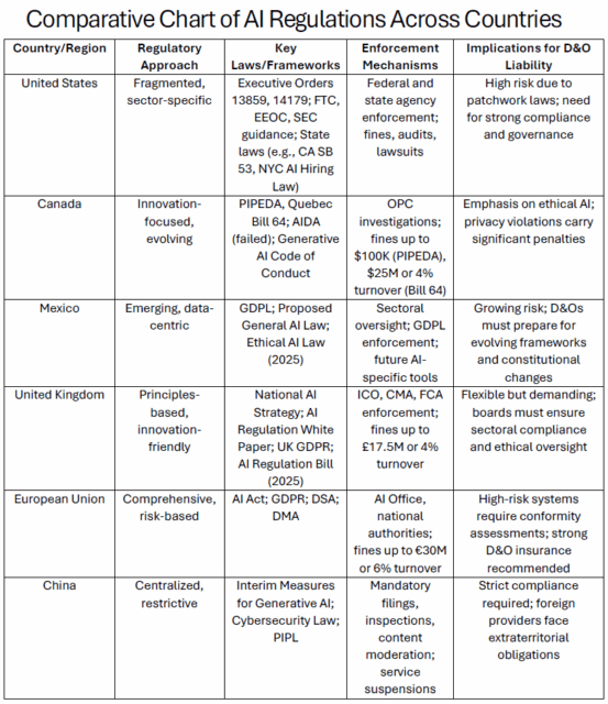 Global regulators are enacting strict AI frameworks to govern the development and deployment of these systems. As the legal and ethical landscape evolves, corporate leaders must proactively address these challenges to protect their organizations—and themselves. This article examines the global regulatory landscape—focusing on United States, Canada, Mexico, United Kingdom, the European Union, and China—and explores implications for D&O liability in navigating this complex environment.