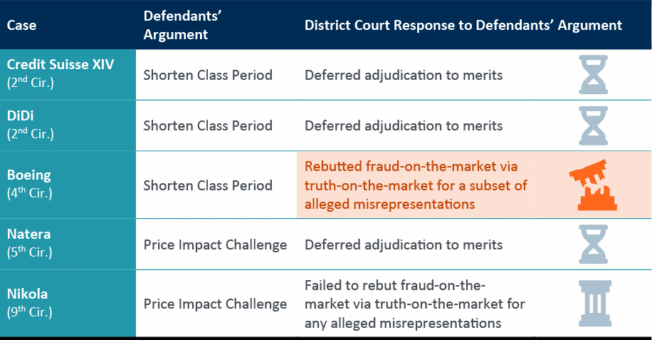 Different courts expressed different preferences for adjudicating truth-on-the-market challenges raised by defendants. In two cases (Boeing and Nikola), the district court engaged with the information that the defendants argued was available to investors, and in Boeing, the district court limited the class period on this basis. In the other three instances, district courts stated that these economic arguments could not be evaluated at the class certification stage, because similar analyses may also be examined in the merits stage as part of the materiality inquiry. Figure 2 below summarizes the Brattle Report’s findings.