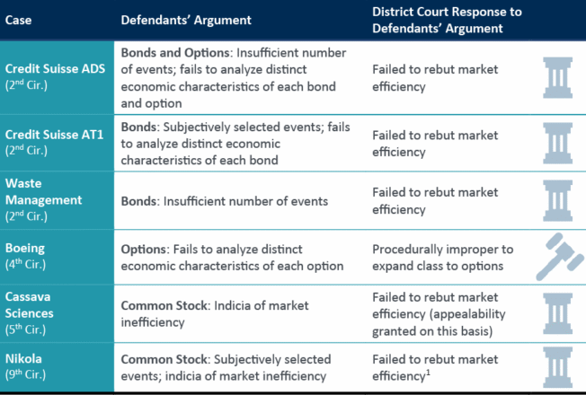 Figure 3: summary of defendants’ challenges to market efficiency and district court responses