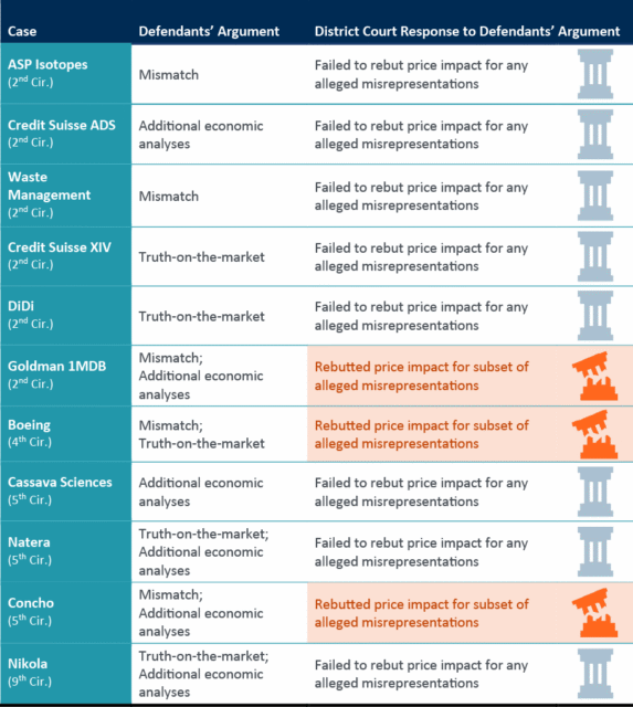 - Theme #3: District courts examined price impact, but the only arguments that prevailed were those following the mismatch framework set out in Goldman Sachs Grp., Inc. v. Ark. Tchr. Ret. Sys. (“Goldman ATRS”).[iii]